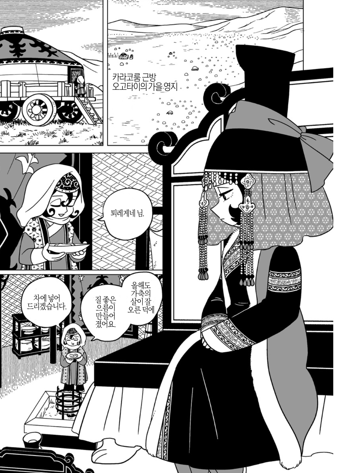 11세기, 흑해 북부 연안부터 볼가 강 유역을 중심으로 하는 초원에 튀르크계 유목 집단 연합체가 살고 있었습니다. 이들 '킵차크'는 유럽 각지를 원정하며 '쿠만(라틴어)'이나 '폴로베츠(러시아어)' 라는 이름을 알리기도 했습니다. 1236년부터 바투(칭기즈의 아들 주치의 차남)를 총사령관으로 하는 몽골군의 침공을 받기 시작했고, 만화 본편 최신화인 37막도 그 침공 중의 이야기입니다.